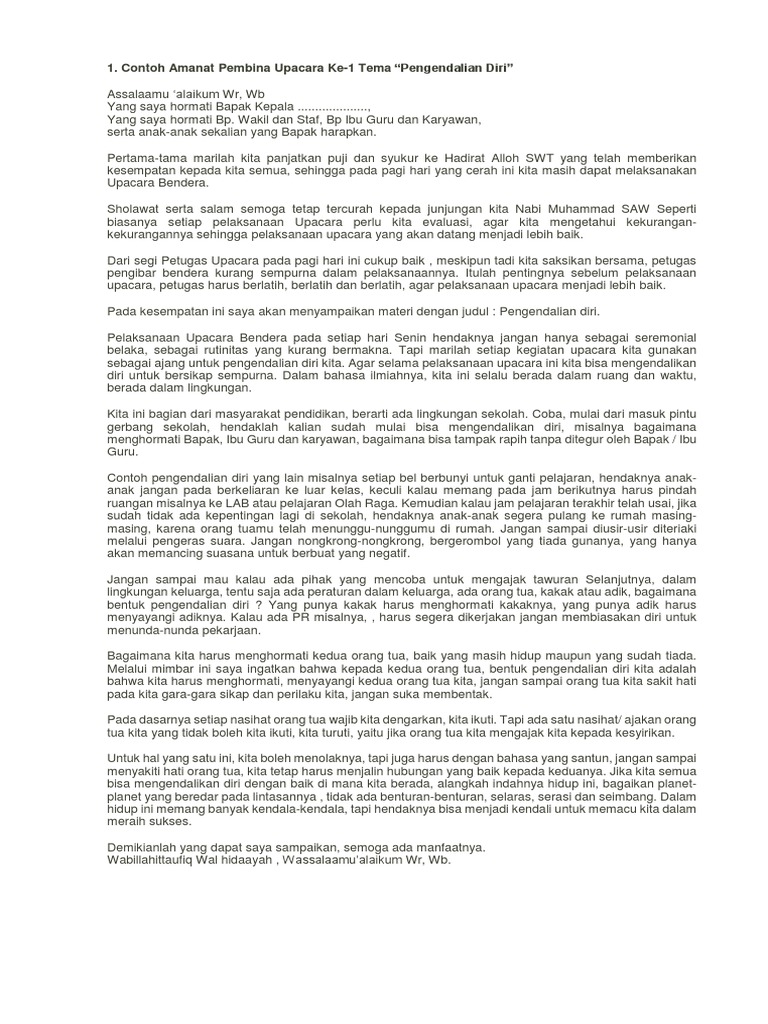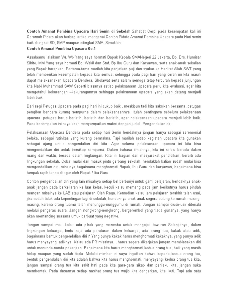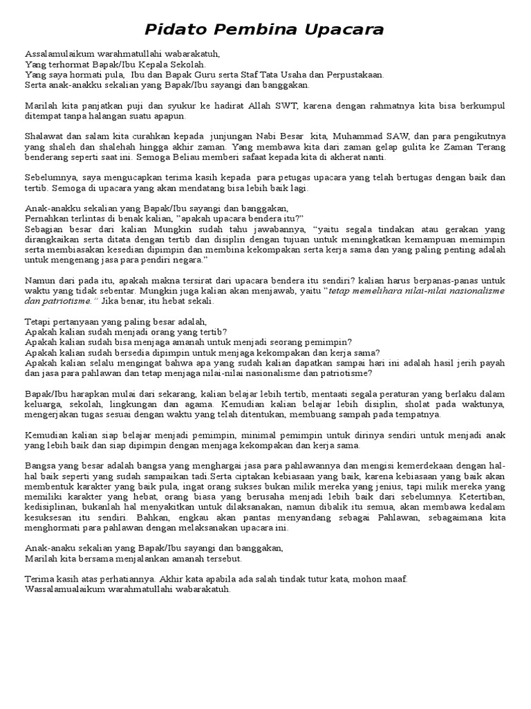 Teks amanat pembina upacara yang kami sajikan dapat anda sampaikan pada upacara bendera ditingkat sd, smp, mts, sma ataupun smk. Isi teks pidato yang tepat sesuai kegiatan tersebut adalah. Demikian amanat pembina upacara pada hari senin ini posting pada advertisement textditag #pidato bahasa inggris mengenai pidato hari senin, #pidato bahasa inggris tentang upacara. Nah berikut adalah contoh pidato 17 agustus untuk pembina upacara. Anonymous ikzvmgisn report pidato pembina upacara mpls.docx.